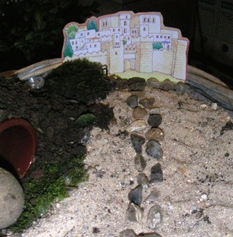 disposer un chemin de cailloux allant vers Jérusalem, décorer le désert (mousse, petites branches ...).