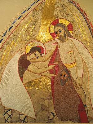 Les femmes qui se rendent au tombeau pour embaumer le corps de Jésus trouvent le tombeau ouvert et vide. Christ est ressuscité ! Des hommes en vêtement éblouissant leur annoncent la Bonne Nouvelle.