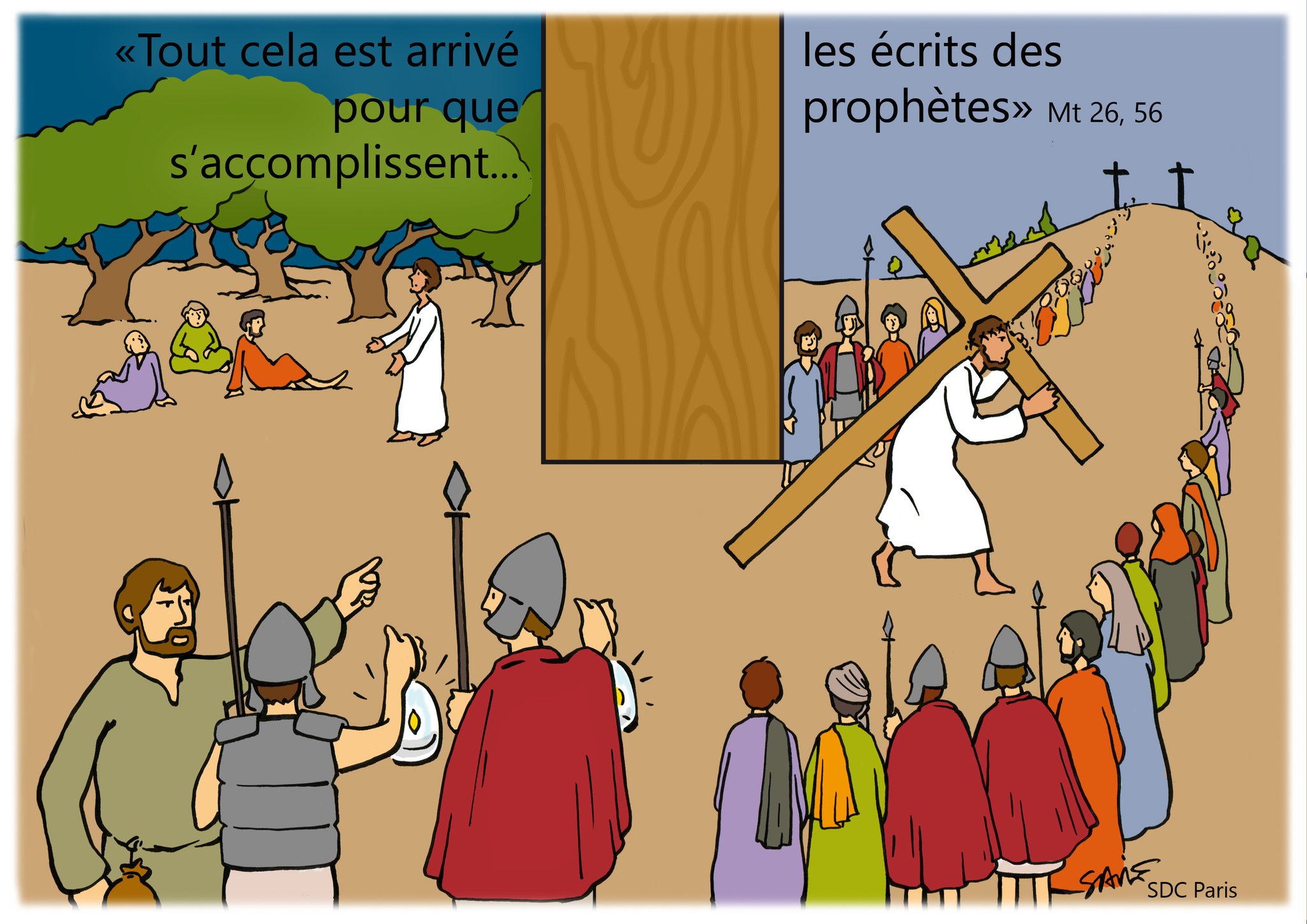 Jésus, portant lui-même sa croix, sortit en direction du lieu dit le Crâne, ou calvaire, en hébreu : Golgotha. Là, ils le crucifièrent, et avec lui deux autres, un de chaque coté et Jésus au milieu. ...